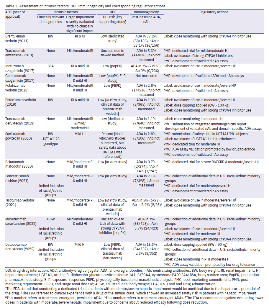 All ADCs were assessed for potential DDIs, though evidentiary approaches varied: 2 relied on dedicated clinical trials, 2 used physiologically based pharmacokinetic modeling, and three applied population PK analyses (Table 3). FDA sometimes accepted cross-program extrapolation, such as using Adcetris data to support Padcev and Tivdak. In other cases, the Agency requested further validation when mechanistic concerns remained unresolved. For instance, sacituzumab govitecan (Trodelvy) was required to provide additional safety data in patients with UGT1A1*28 variants, reflecting concern over metabolic interactions with irinotecan’s active metabolite. Similarly, for polatuzumab vedotin (Polivy), in vitro results suggested limited cytochrome P450 involvement, but the FDA still imposed labeling restrictions regarding use in patients with moderate to severe hepatic impairment, indirectly linked to DDI risk. These experiences highlight both the Agency’s pragmatic acceptance of scientifically justified extrapolation and its insistence on clear mechanistic rationale for transporter or enzyme interactions.