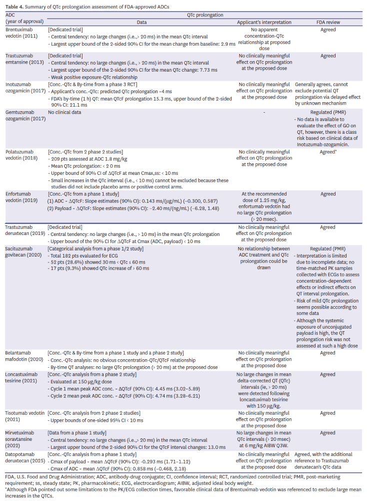 Evaluation of cardiac repolarization risk relied on a mix of dedicated QTc trials (e.g., Adcetris, Kadcyla, Enhertu) and concentration–QTc modeling in later programs (Table 4). Despite the growing reliance on modeling, Mylotarg and Trodelvy still received PMRs due to inadequate data. For example, reliance on early-phase concentration–QTc modeling needed supportive clinical context, as shown by datopotamab deruxtecan where reference was made to trastuzumab deruxtecan’s safety profile. This highlights FDA’s willingness to accept innovative approaches while retaining conservative standards when data completeness is in question.