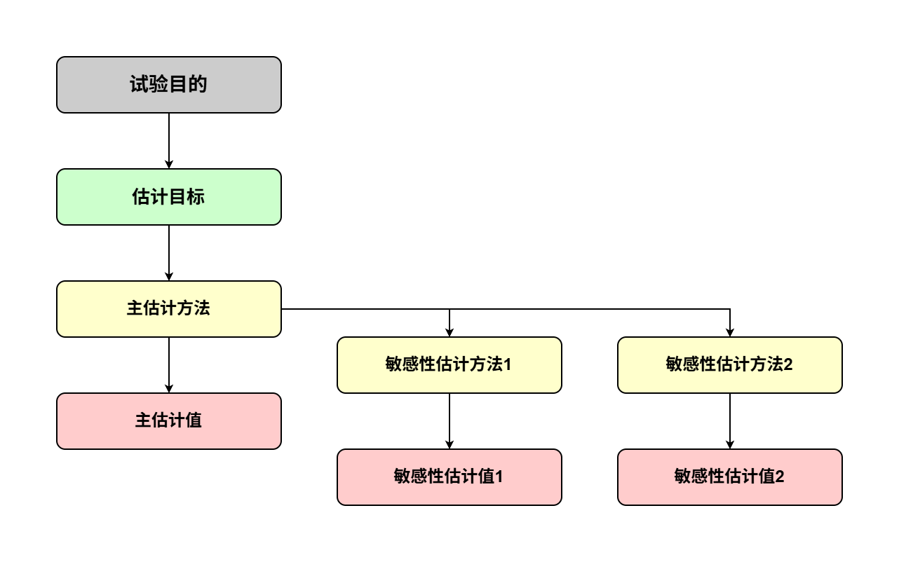 试验方案应当定义并明确说明与主要试验目的相对应的主要估计目标。方案和分析计划中应预先规定与主要估计目标一致并对应主要分析的主估计方法,以及当假设偏离时用来探索结果稳健性的合适的敏感性分析。对于可能支持监管决策的次要试验目的(例如,与次要变量相关),相应的估计目标也应当明确定义和说明,并且每个估计目标都有相应的主估计方法和合适的敏感性分析。还可以考虑属于探索性质的额外的探索性试验目的,此时也会产生额外的估计目标。